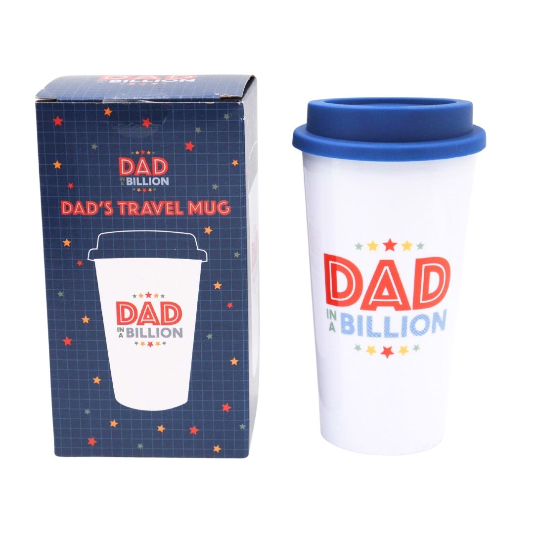 Practical, stylish and full of appreciation, the Dad In A Billion Travel Mug is the perfect Father's Day gift for dads on the go. Featuring a bold "Dad In A Billion" slogan with colourful star detailing, this reusable travel mug is ideal for commuting, work, or weekend outings. Presented in a coordinated retail-ready box, it makes an eye-catching addition to any Father's Day display.
