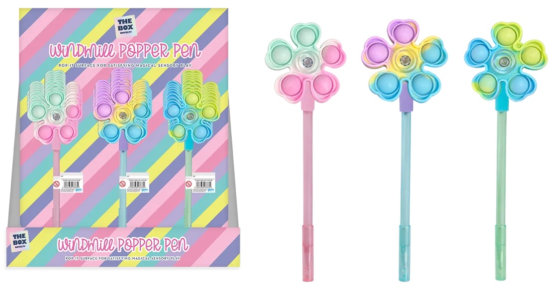 The Windmill Popper Pen combines everyday writing with a built-in fidget element, featuring a flower-style windmill spinner mounted at the top of each pen. Supplied in an assortment of three ombre colourways-pink, green, and blue-each pen is finished with a five-petal windmill design, with heart-shaped petals that spin freely and include individual poppers. Writing in black ink, this format is well-suited to stationery and impulse ranges, offering clear visual appeal and interactive interest. Presented in a CDU, it's easy to display, range, and replenish alongside other fidget stationery items.