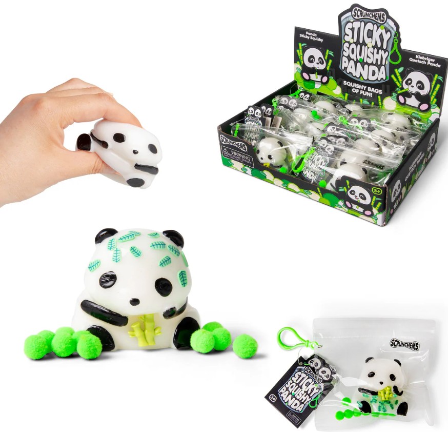 Get ready to squish in style with the SCRUNCHEMS STICKY SQUISHY PANDA! This delightful squishy is bursting with fun textures and charming details that bring panda personality to life. Inside, you'll find: